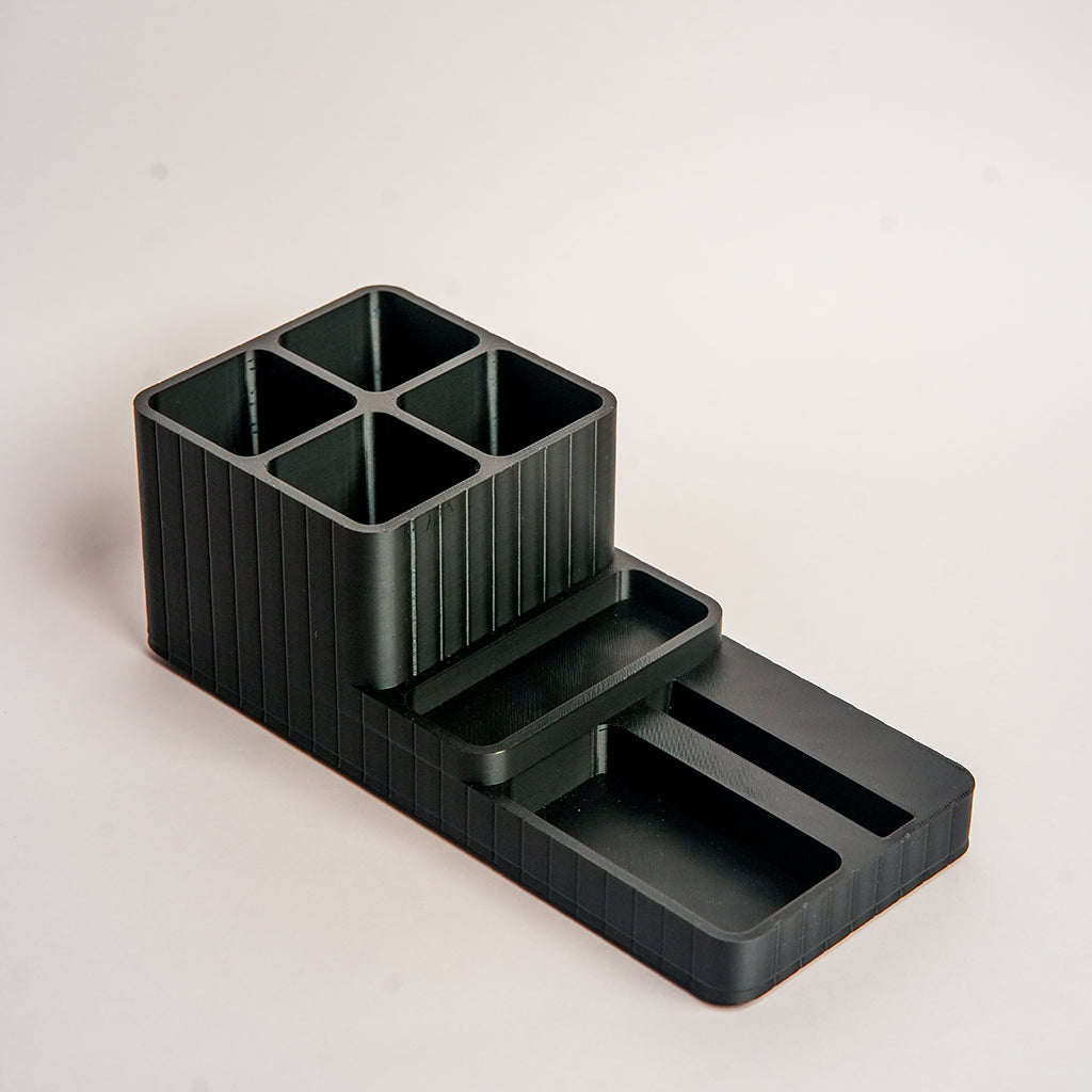 Black plastic desk organizer with compartments on a light gray background